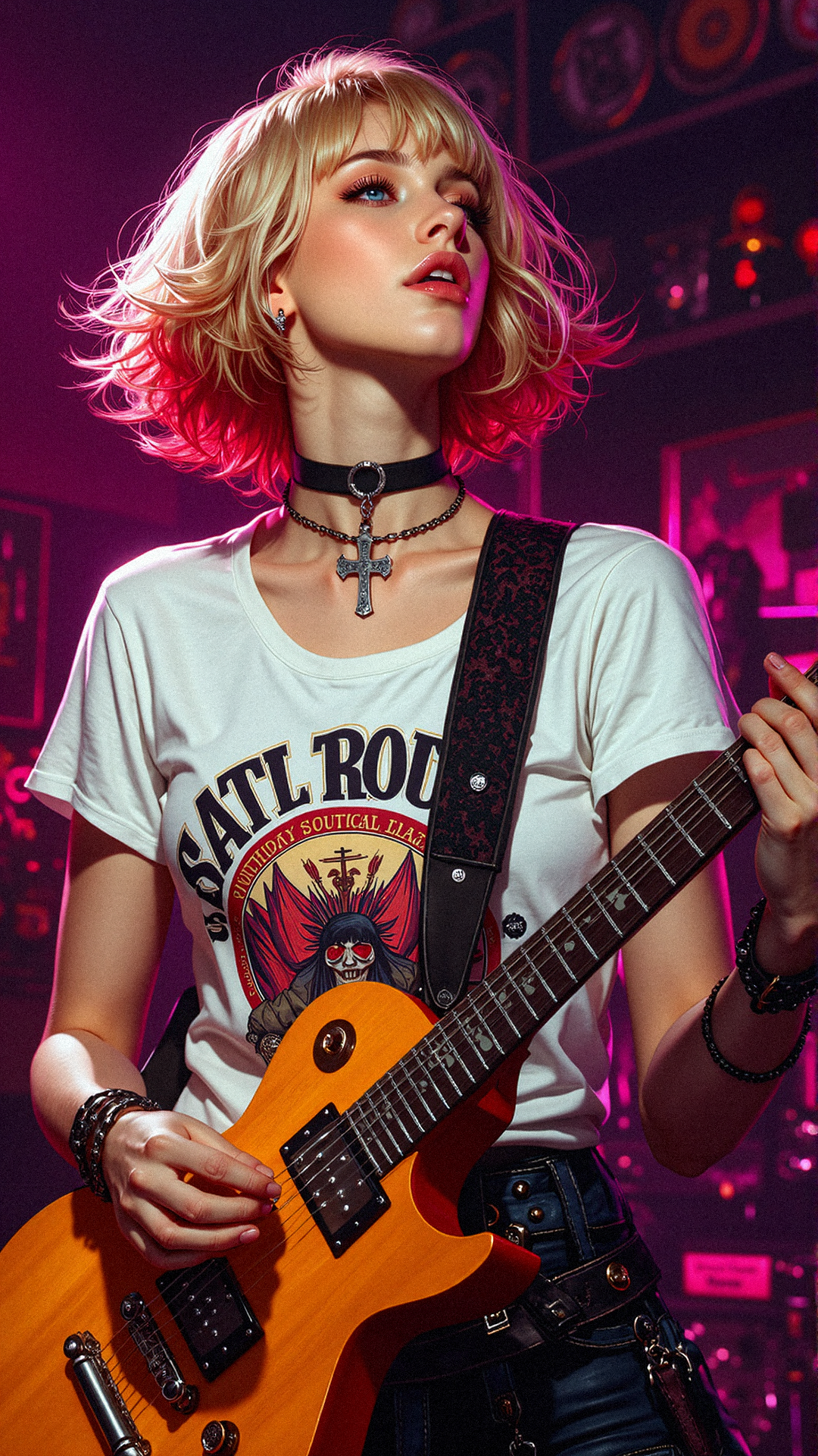 A woman with short, wavy blonde hair fading to red at the tips, light blue eyes, long eyelashes, and glossy pink lips is passionately playing an electric guitar. She wears a small silver cross necklace and a white T-shirt featuring a rock band logo. In the vibrant atmosphere of a club, she's headbanging in rhythm with the music, fully immersed in the moment