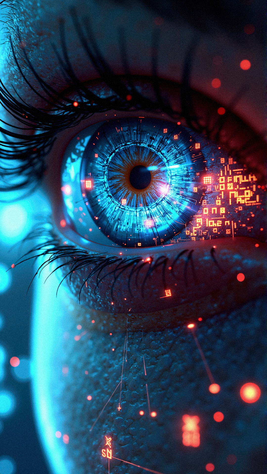 "Quantum Rain Vision" "A highly detailed shot of a cybernetic eye focusing through a cascade of vibrant digital rain. The pupil glows with layers of intricate symbols, and faint reflections of geometric neon squares are visible on the glossy surface of the eye. The background is a blend of sharp, intersecting grids and glowing orbs, creating a hypnotic, high-tech composition."