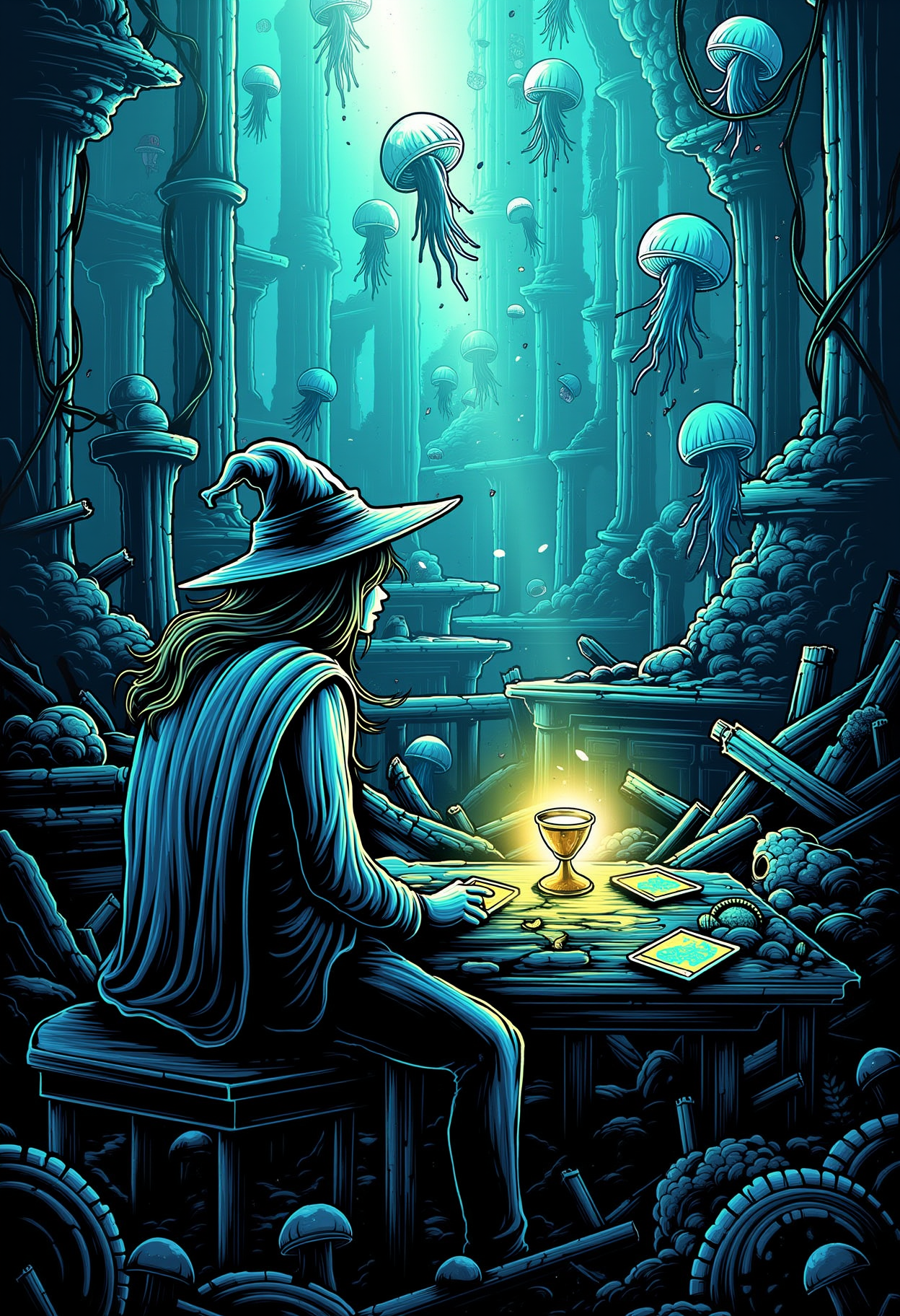 A sea witch adorned in tattered robes sits at a barnacle-encrusted table aboard a shipwreck. Tarot cards, glowing with aquatic blue and green hues, lie scattered around a small golden chalice. Ghostly sea creatures swim through the water-filled room, casting shimmering reflections. Bioluminescent jellyfish float above, casting a soft ethereal light <lora:dvr-dm-flux:1> dvr-dm-flux
