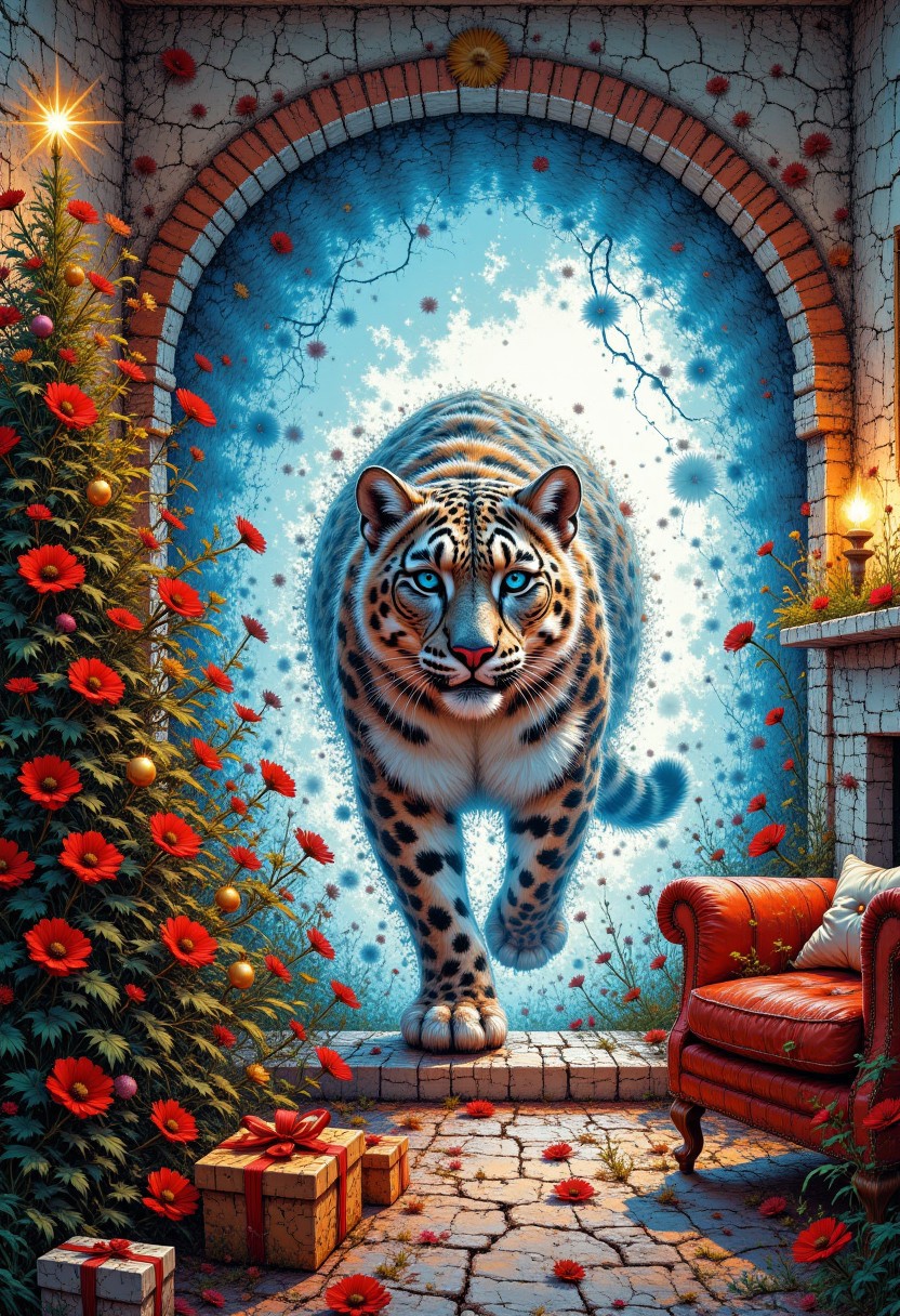A detailed image of a portal to another dimension from which a snow leopard emerges towards us. a portal in the form of a swirling vortex of energy and particles, moving plasma and fractal discharges. The snow leopard has half-emerged from the portal and we see its fluffy fur and expressive glowing blue eyes. on one side of the portal Christmas living room
