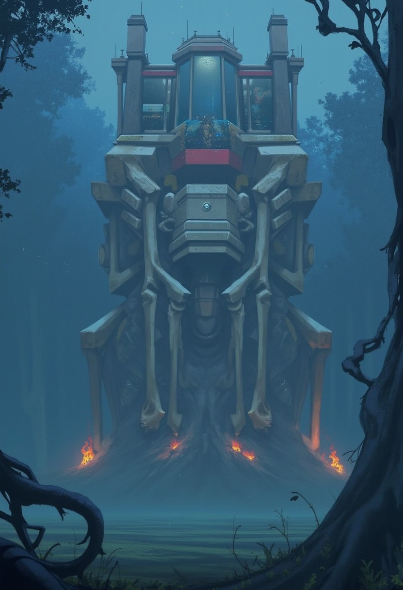 jc4rmes, a large geometric building rising from a swamp, constructed atop the exposed skeleton of an ancient giant. The structure is composed of stacked geometric objects. Ancient, petrified trees grow out of the building, their gnarled roots merging into its walls. Small fires flicker within others. Gears and mechanical parts are integrated into the structure. Quiet tension, majestic and alien amidst the eerie swamp.