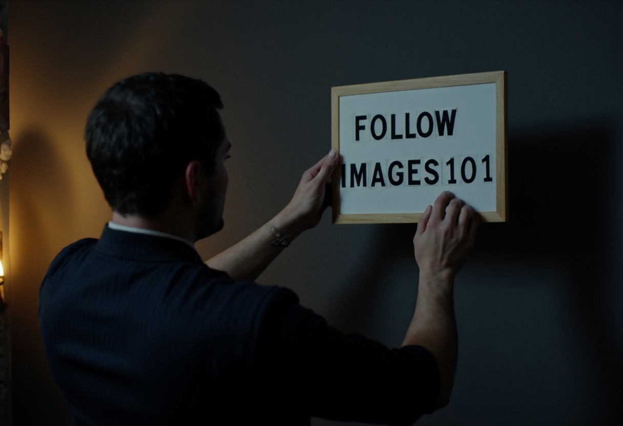 batman holding in the middle of the screen a sign saying ,(( follow images 101 ))