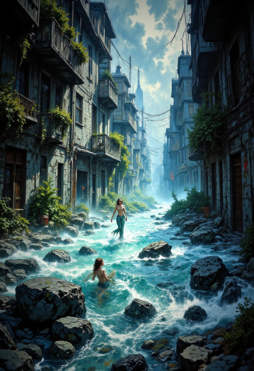 M4gicalL1nes, an alley in a ghetto flooded with torrents of raging water, in the water there is a beautiful mermaid swimming and splashing, smiling nonchalantly and having fun