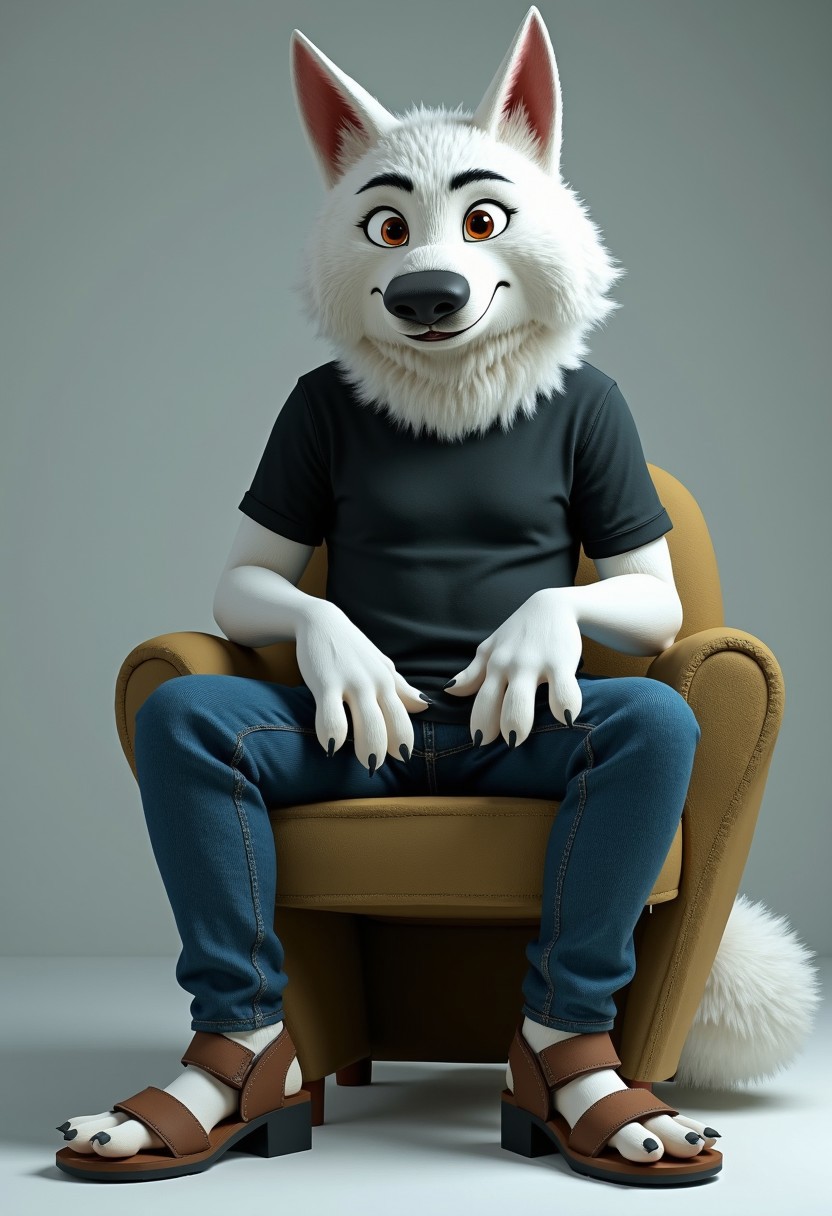 Gary, Zootopia, Wolf, Timberwolf, White fur, Orange irises, sitting on his chair,showing,sandals smiling face, hands, T-shirt, long blue jeans, brown velcro woman's sandals,plartform, heeled high heels, paws claws, close-up, focus on feet, giants, fetish, macro, feet, work, realistic 3D, render, standing, Fluffy, tall, thin, homemade,