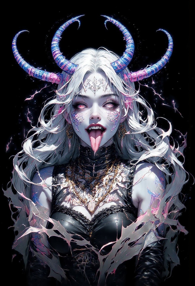 high quality, ultra detailed, colorful, abstract, fantasy, aidmaMJ6.1, bo-abyss, a digital drawing in an anime style, featuring a fantastical, otherworldly creature with a blend of fantasy and horror elements, the subject is a female character with pale blue skin and long, flowing white hair that cascades down her shoulders, her eyes are a striking, glowing pink, and her mouth is open wide, revealing sharp, pointed teeth, with a long, dripping pink tongue, she has large, pointed ears and a pair of prominent, curved, blue and pink horns protruding from her head, the horns are adorned with intricate, glowing patterns in shades of blue, purple, and pink, adding a surreal and otherworldly quality to her appearance, she wears a black choker around her neck and a black, sleeveless top that appears to be made of a shiny, metallic material, the background is a solid black, which contrasts sharply with her vibrant colors, making her stand out vividly, the overall composition is dynamic, with the character's expression and the flowing, ethereal quality of her hair and the glowing effects adding to her otherworldly appearance, partially blended with abstract digital elements. The scene has a dark, moody ambiance. The background features layers of glitch art, fragmented texts, and metallic textures. contrasting against the monochromatic tones of black, grey, and hints of green. Smudged paint and scratches add a sense of decay and technology.