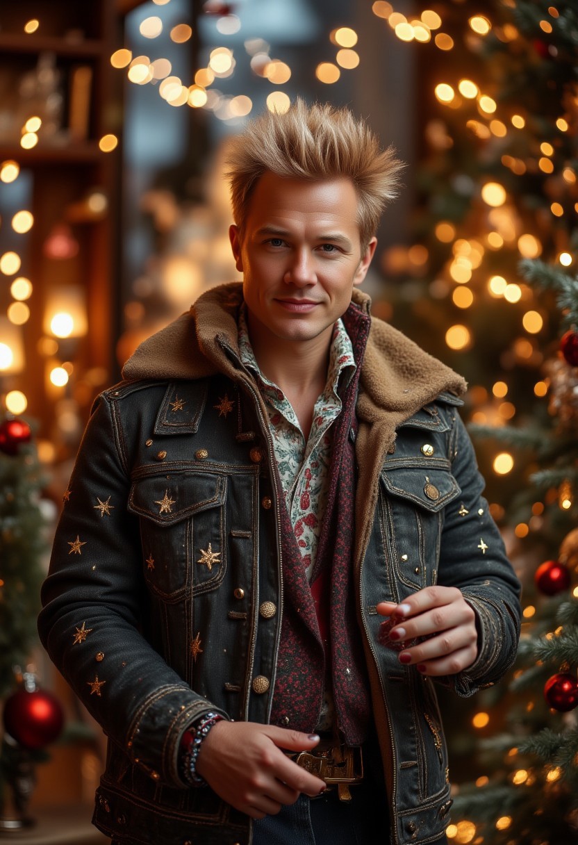A male with a spike hair is wearing a casual clothes with jacket jeans. He seems amused at a business chic christmas party, (dreamstar:1.3), stars, sparkling