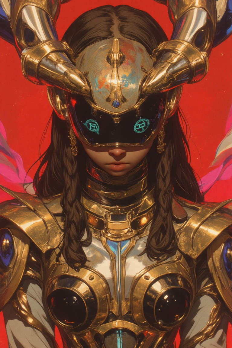 A highly stylized digitally drawn hyper-realistic artwork featuring a brown-skinned woman adorned in a spectacular, high-tech ensemble composed of radiant, gold-hued metallic plates and translucent, holographic panels that ripple with shifting colors. Her face is framed by a sleek, contoured headdress that emits a soft, warm glow, adding an aura of regality. She wears an angular, transparent mask etched with glowing cyan runes that partially obscure her striking, confident expression. Her braided hair cascades down her shoulders, interwoven with golden threads that catch the light. The background is a rich gradient of crimson red and neon pink, adorned with flowing, ribbon-like lines that give a sense of energy and motion. The radiant interplay of reflective metals and glowing holograms enhances the visual impact of her attire, emphasizing its futuristic sophistication. Standing in a dynamic yet poised pose, she exudes a commanding presence that draws the viewer’s eye. The harmonious blend of light, color, and texture in this piece creates a bold, avant-garde masterpiece that celebrates strength and innovation.