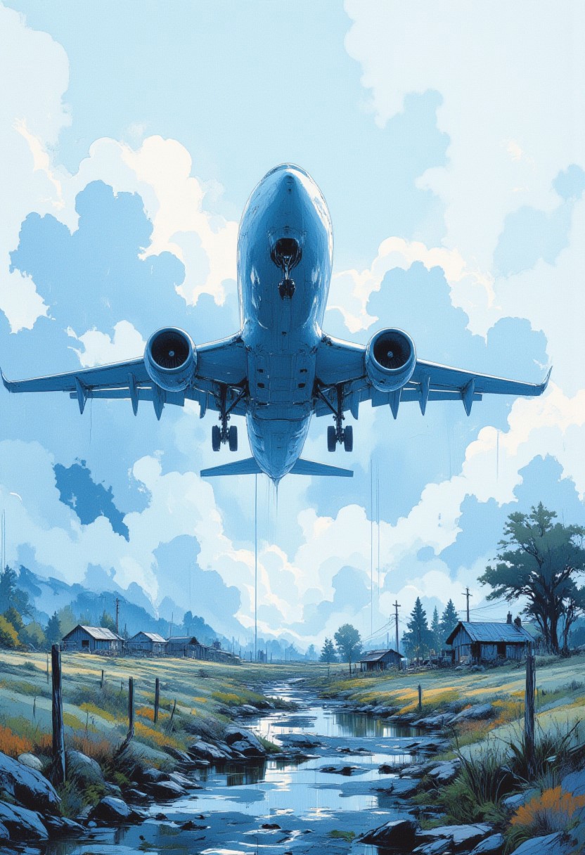 OBxiaoxiang, CAICO, inksketch blue and white theme, Close up massive passenger plane subtly appears behind thick foggy sky above a quiet ranch, view from below, megalophobic