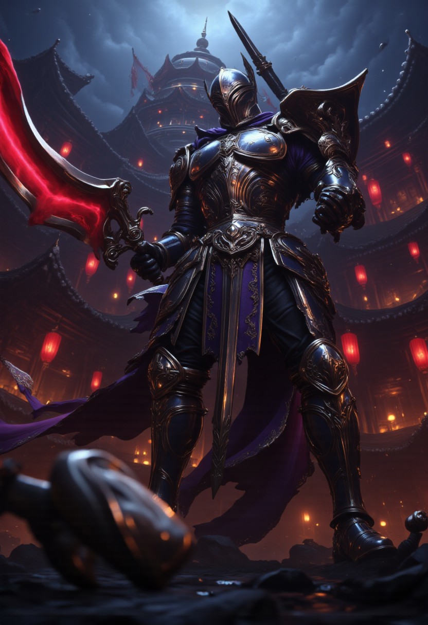 A knight in full armor holding a sword and striking a red flame-like weapon. The knight is standing in front of a cityscape with traditional Chinese buildings and pagodas in the background. The sky is dark and cloudy and the buildings are lit up with red lanterns creating a dramatic and ominous atmosphere. The overall mood of the image is dark with the knight's armor and sword standing out against the red glow of the city. The image conveys a sense of power and strength as if the knight is ready to fight. Hyperdetailed.