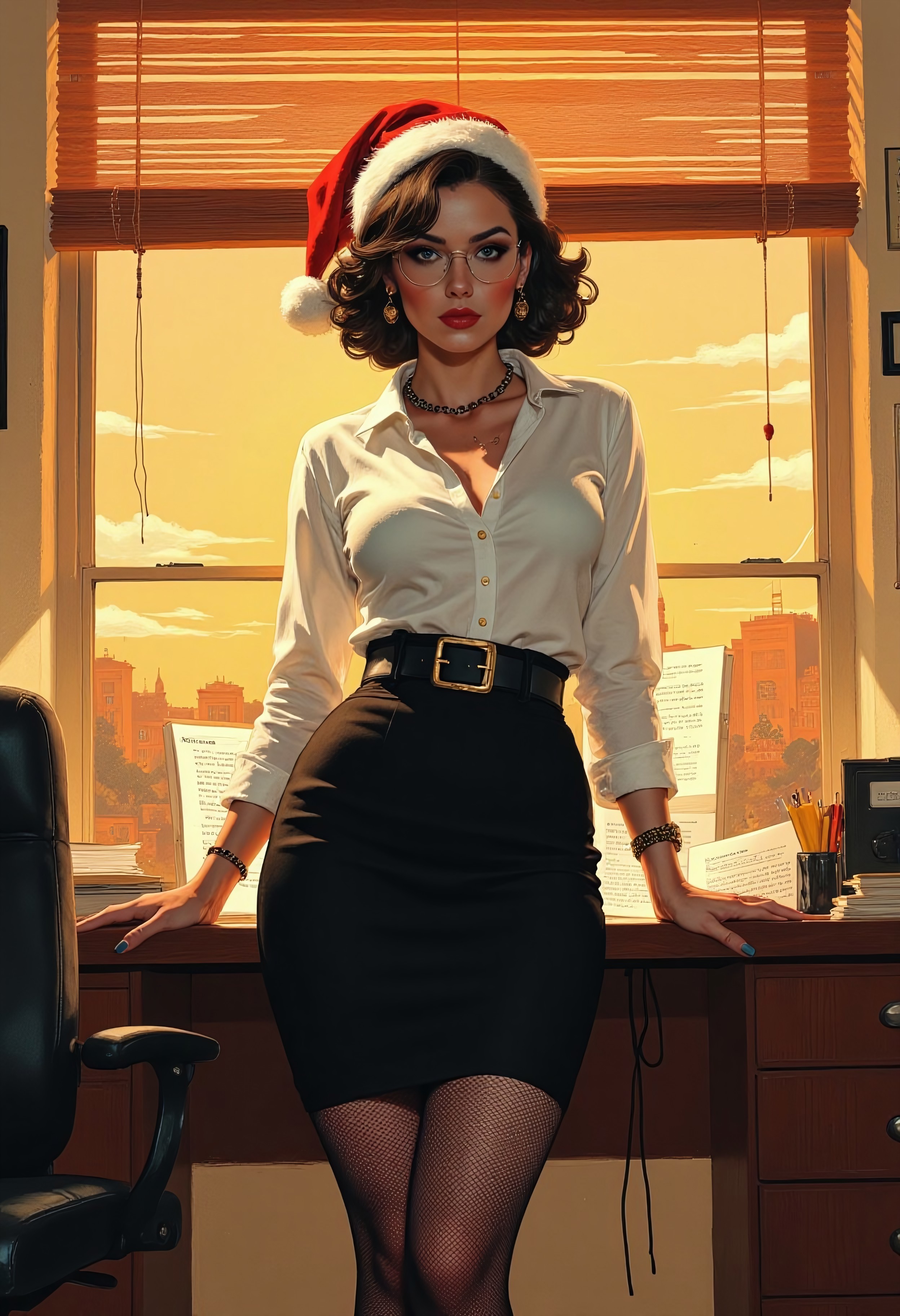 A graphic erotic comics illustration style featuring a pinup woman, nsfw, 60s disco funk,artsy aesthetic, sexy, revealing, beautiful mature female secretary in an office, wears a white skin-tight blouse and a black skin-tight skirt, a Santa hat, stockings and gaterbelt, glasses, dominant, arrogant facial expression, 60s retro, film noir, warm colors, light and shadow, sunset, retro setting,plain background, simple background. Pinup art.
