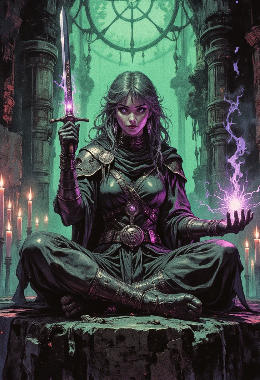 fill the scene with smoke and haze, authenticity, A mystical scene depicting a beautiful woman in an ancient, fantasy style. She is sitting in a meditative pose on a stone platform in a gloomy, magically illuminated cave. the colors are dim, The background is filled with many green and purple fire on candles that emit a soft glow. The character herself is dressed in ritual or combat armor with elements of leather and metal, holding a long knife decorated with magical symbols in one hand. Her hairstyle is messy with medium lenght. In her other hand, she creates magical energy that glows and sparkles. The atmosphere of the picture is filled with magic, mystery and a sense of power. The cave looks dark, but the glow of the candles and magic adds bright accents.