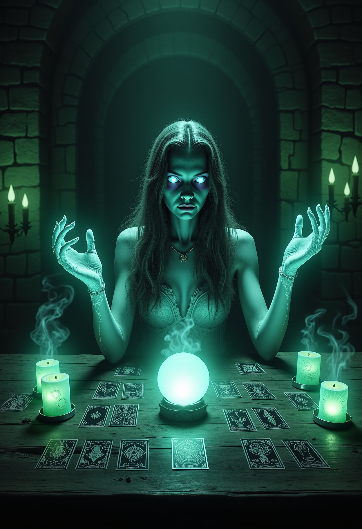 A pale necromancer with glowing silver eyes sits at an ancient wooden table, surrounded by an array of tarot cards glowing faintly with eldritch symbols. Ghostly, translucent hands reach out from the shadows around her. The room is dimly lit, with flickering green candles casting eerie patterns on the cracked stone walls. Wisps of smoke swirl around, illuminated by the faint blue glow emanating from a crystal ball at her side <lora:Dever_Flux_Enhancer:0.5>