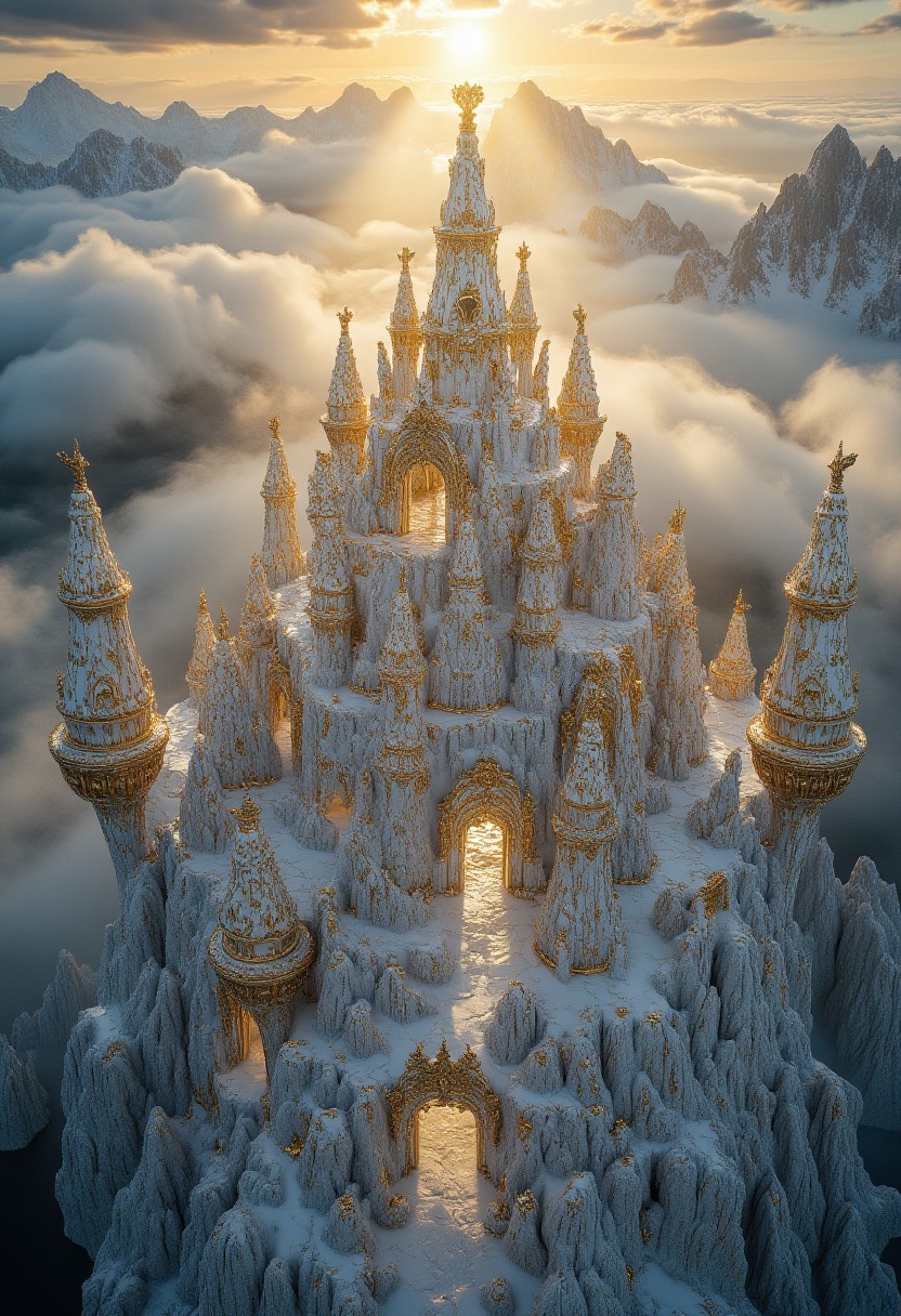 Create a complex and highly detailed high elven city in Gold Porcelain style. the view is from high above, birdseye view. sun rays, the sun is shining, gorgeous view, dreamlike, ethereal, fantastic, masterpiece, award winning, stunning, snow, cloudy