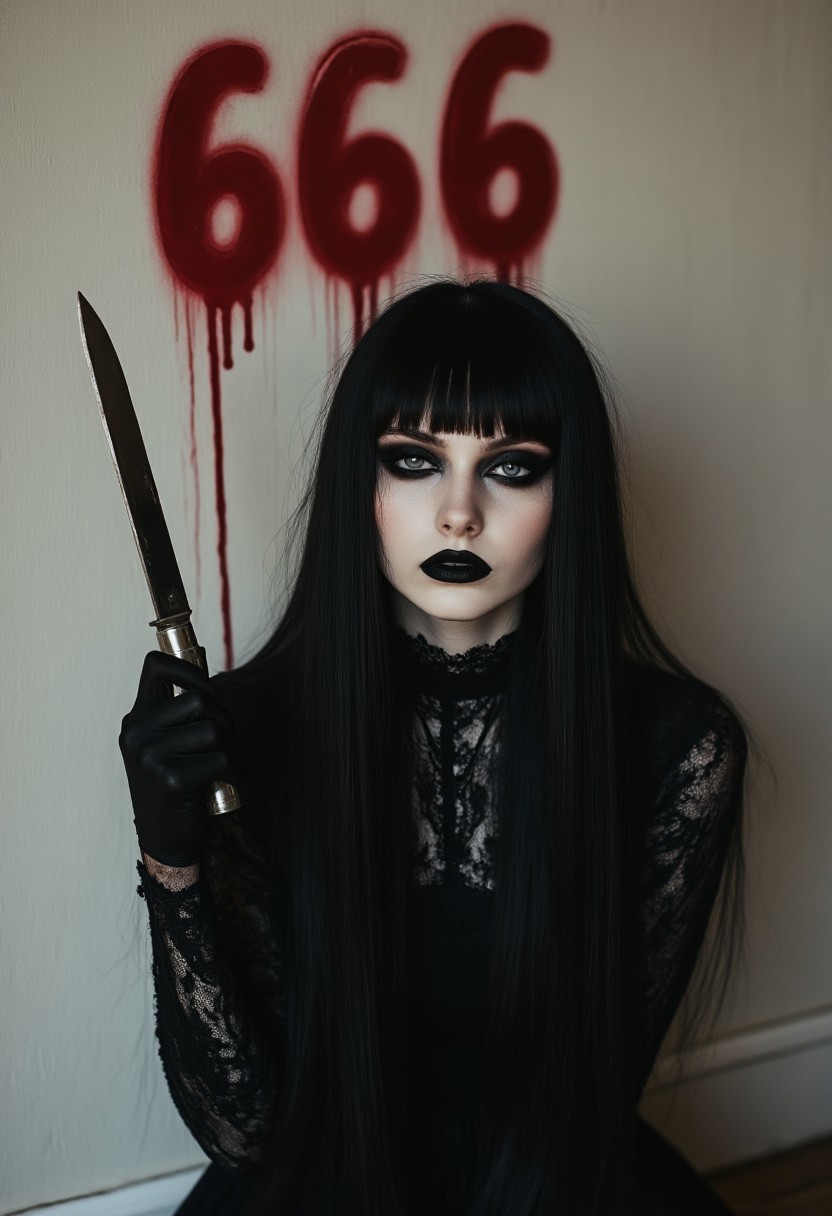 FictionalCrystal, a goth girl with heavy black eye makeup and black lipstick. holding a knife and looking scary. the numbers "666" on the wall in red dripping paint