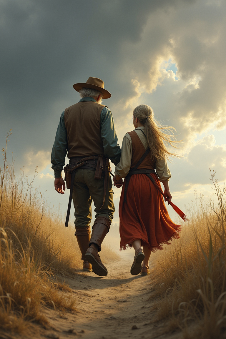 Masterpiece, closeup, hd, 8K, Fantasy art, award winning drawing of a old male farmer and a old female farmer in a windy landscape helping each other walking, rugged clothes romantic, storm in background, back view, intricate details