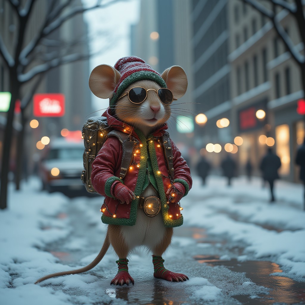 a detailed and realistic image of a mouse wearing a costume with xmas theme and colorful socks, the clothing have small lighting accessories simulating a Christmas garland lights, with intricate details in the fabric, accessories in the body and sunglasses reflecting the city lights. the mouse is looking at the sky and a little amount of snow is accumulated in his face and body, the location is a snowing city at midnight, snow is falling and a frozen car is in the background, city lights shines in the street and reflects in the ground. a dense amount of fog is floating in the scene with light particles.
