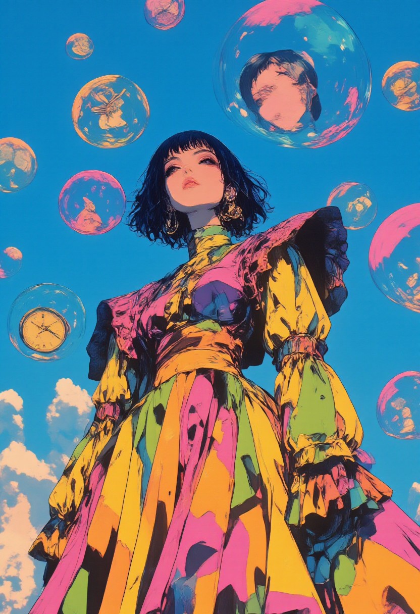 A vibrant and surreal photograph featuring a young woman with a confident expression, standing against a clear blue sky. She wears an elaborate, flowing dress with a bold, colorful pattern in pink, green, yellow, and orange hues, evoking a psychedelic feel. The dress features ruffled sleeves and a high collar, enhancing its whimsical and dynamic appearance. Her short, dark hair is styled in a modern, slightly messy look, and she sports large, silver hoop earrings, adding a touch of edginess to her look. The background showcases large, transparent bubbles floating in the air, each containing different images: one bubble holds a close-up of a woman's face, while another encases a vintage clock. The bubbles are scattered around her, creating depth and contributing to the surreal atmosphere. The woman is positioned at a low angle, looking up towards the bubbles and the expansive sky, conveying a sense of grandeur and wonder. The lighting is bright and even, with a warm, dreamlike quality that enhances the vibrant colors of the dress and the translucent bubbles. The photograph is highly detailed, capturing the textures of the dress and the smooth, reflective surfaces of the bubbles. The overall composition blends fashion photography with surrealism, producing a striking and thought-provoking image that feels both fantastical and grounded.
