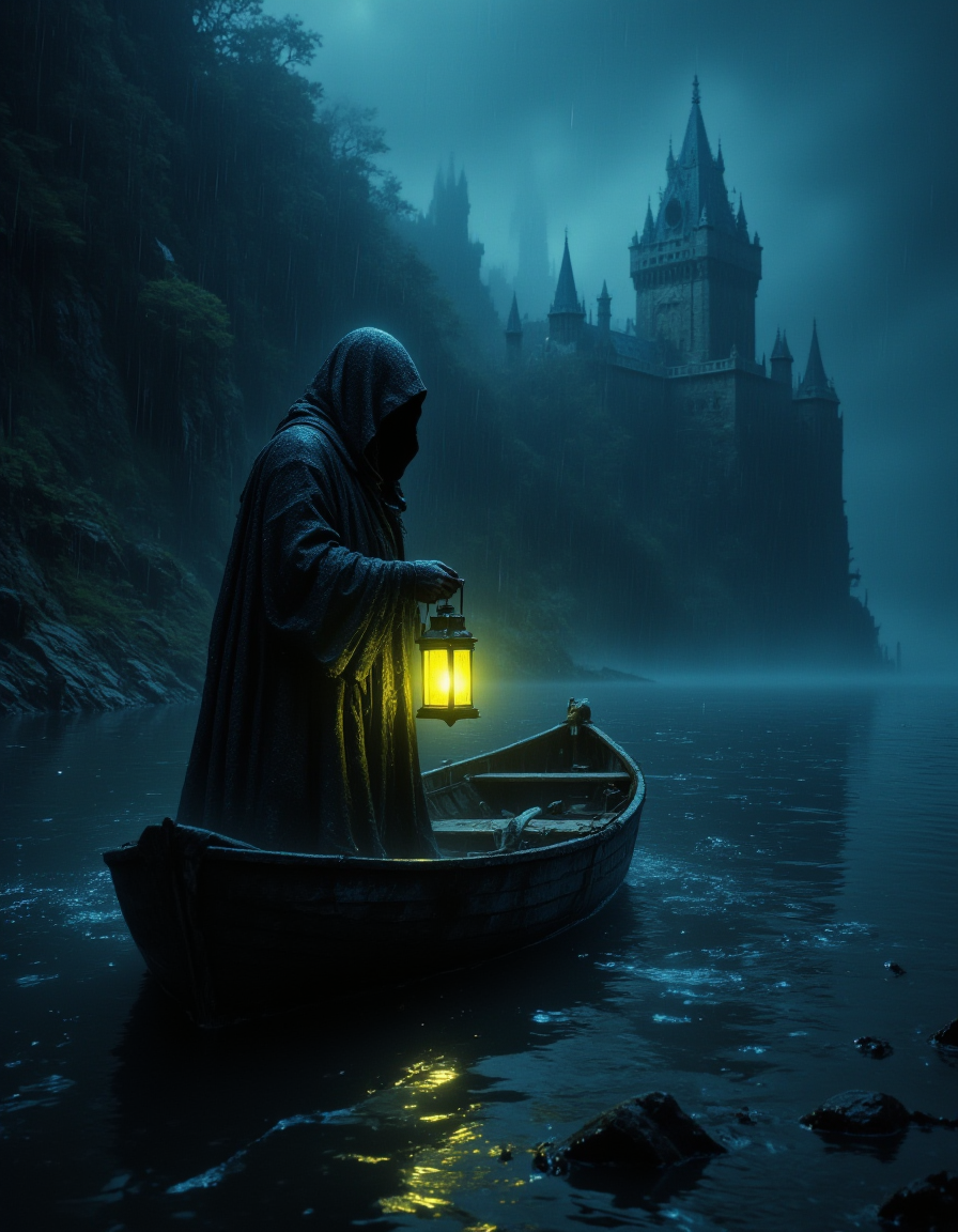 A cloaked, spectral figure, reminiscent of the Grim Reaper, stands in a small, weathered boat on dark, choppy waters. The figure's face is obscured by a deep cowl, and they hold a glowing lantern that casts an eerie yellow light, illuminating the immediate surroundings and reflecting on the water's surface. A gothic, imposing castle looms in the background, shrouded in mist and rain, its spires barely visible. The scene is dark and ominous, with a heavy atmosphere of dread and mystery. The composition is a medium shot, slightly from the side, focusing on the figure and the boat, with the castle providing a distant backdrop. The artistic style is a blend of dark fantasy and gothic art, with a painterly feel, emphasizing texture and dramatic lighting. Rain streaks are visible, adding to the sense of a stormy night, HKMagic, <lora:CinematicStyleFlux_v1:0.5>, <lora:VividlySurreal:0.5>, <lora:Dever_Flux_Enhancer:0.4>, <lora:FantasyWizardWitchesFluxV2-000001:0.8>