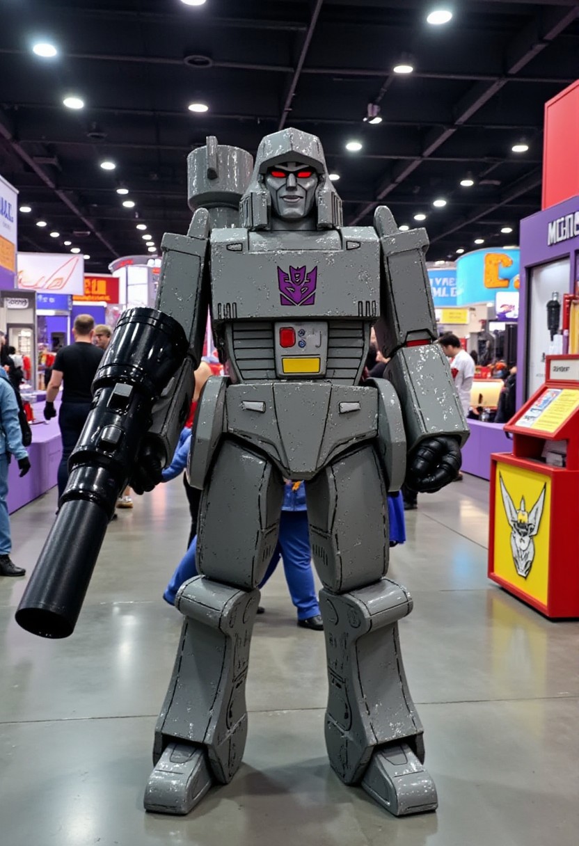 A man cosplaying as Megatron, standing confidently in the middle of a bustling convention hall. His costume is intricately detailed, with metallic gray armor plates, and a massive fusion cannon mounted on his forearm. The helmet resembles Megatron’s signature design, complete with sharp angular features and glowing red eyes. The convention hall is filled with colorful booths, banners, and other attendees in elaborate costumes. Bright overhead lights illuminate the scene.