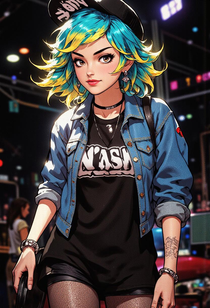 flat anime pic, Portrait, young woman, sharp features, multicolored hair of cyan and yellow tips, black cap, jeans top, black t-shirt, bracelets, chocker, earrings, pantyhose, mole under the eye, slight smile, background is black with dim lights, some mild dynamic pose