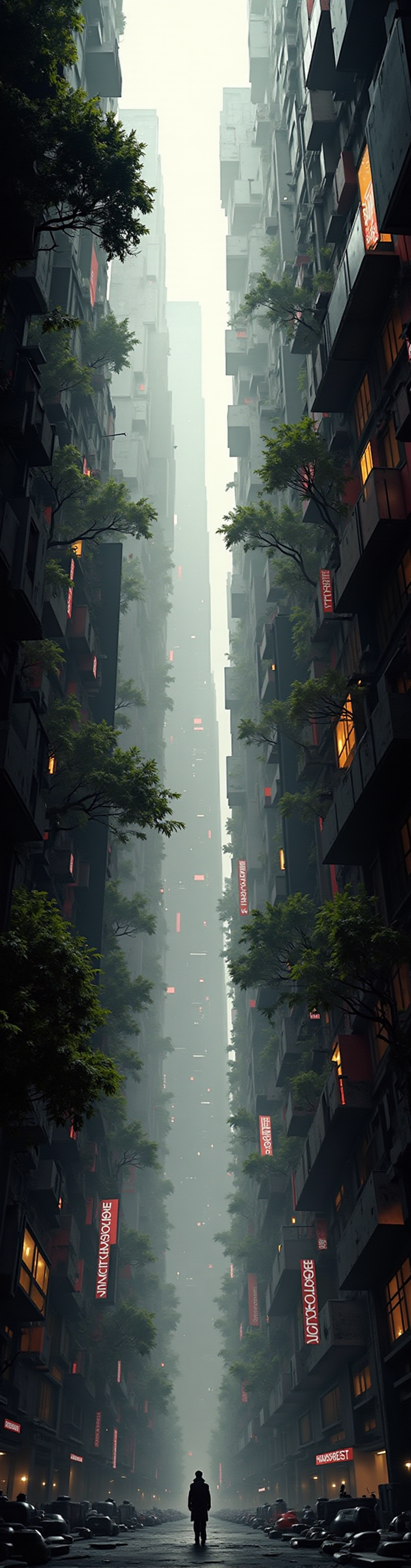 cyberpunk cityscape image captures a scene of urban solitude and quiet introspection. The perspective is from the ground looking up at the towering structures around, giving a sense of scale and grandeur to the buildings. The color palette is predominantly muted grays and browns, reflecting the overcast sky above, but with subtle hints of green in the form of scattered trees adding a touch of life to the otherwise bleak landscape. The mood is somber and reflective, as if inviting the viewer to share in the feelings of melancholy expressed by the lyrics. The composition is balanced, with the buildings occupying the center of the frame and the trees dispersed around the edges, creating a sense of depth and perspective. The lighting is diffused, casting soft shadows and muting the colors further, adding to the overall serene atmosphere. Despite the emptiness of the scene, there's an undeniable presence of human emotion conveyed through the lyrics and the composition of the image itself. The result is a powerful blend of technical skill and artistic expression that tells a story without words. . neon lights, dark alleys, skyscrapers, futuristic, vibrant colors, high contrast, highly detailed