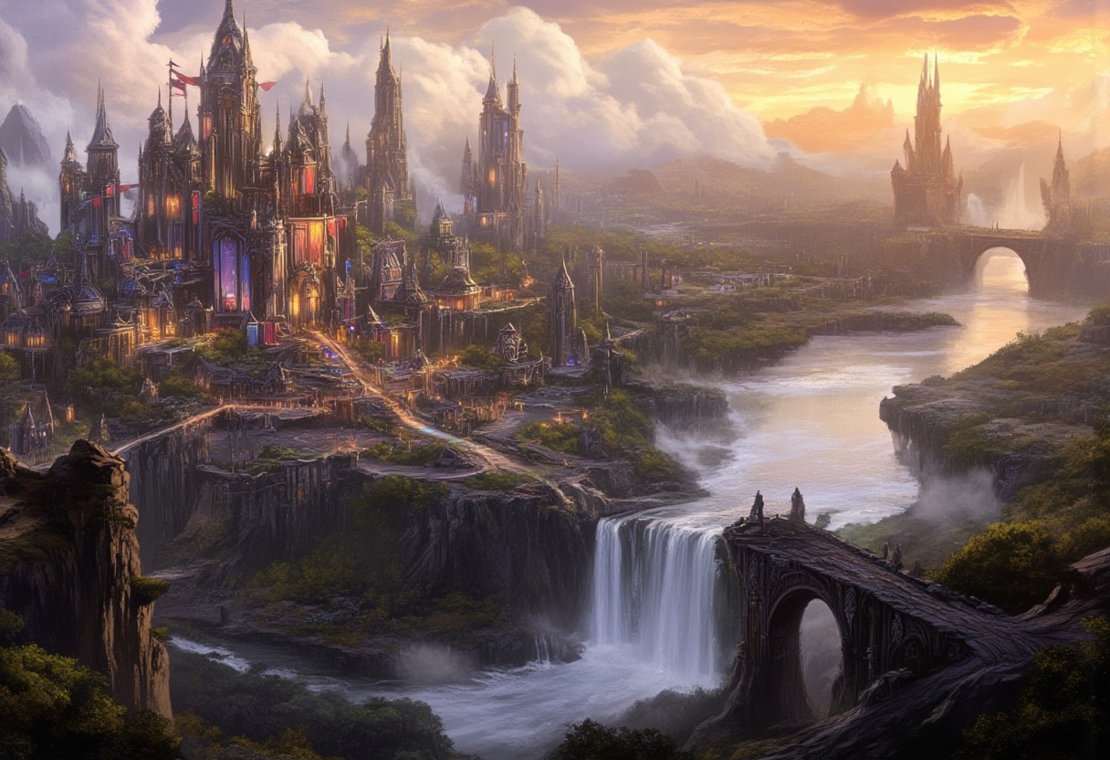 A high-angle view of a magnificent medieval fantasy city inspired by China, nestled along a wide, serene river. Towering buildings rise gently toward the center, adorned with intricate rooftops and vibrant banners fluttering in the breeze. The sunset casts a warm glow, illuminating the scene with hues of orange and gold, creating reflections upon the water. Lush greenery lines the riverbank, and lanterns begin to light up, adding to the ethereal ambiance. A detailed digital painting capturing the enchanting beauty of this urban landscape under the evening sky.