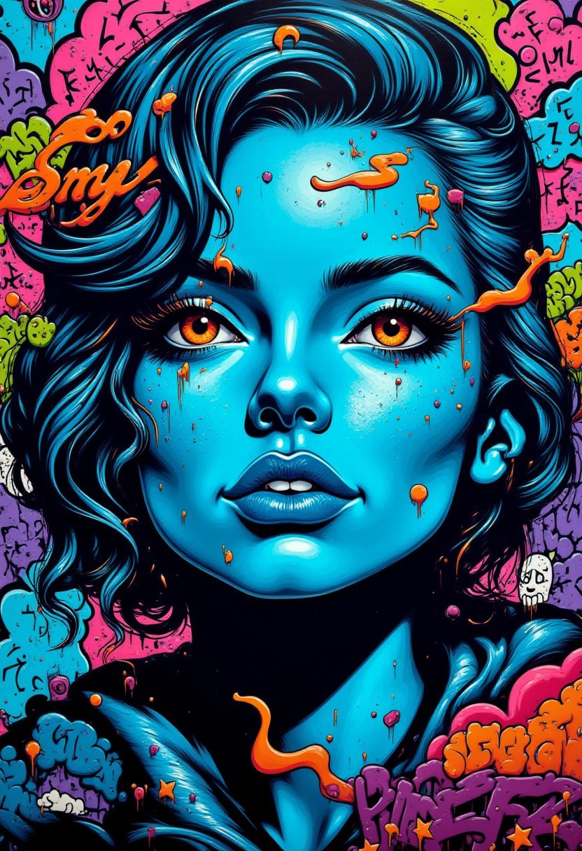 "Create a high-quality, extremely detailed digital artwork of a vibrant, graffiti-inspired, stylized portrait of a woman's face. The woman's face is rendered in a striking gradient blue color, with a slightly melancholic expression. Her eyes are a striking orange color and seem to glow, adding a sense of intensity and depth. Her lips are a deep blue, creating a striking contrast against the gradient of her skin. The background is a dynamic, colorful graffiti wall with bold, swirling patterns and readable phrases in vibrant shades of blue, green, purple, and red, enhancing the futuristic and stylized feel of the portrait."