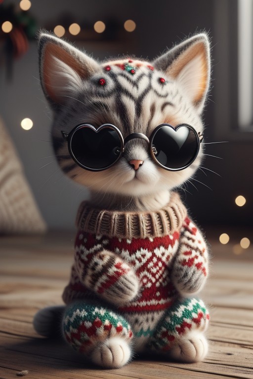 little kitty wearing sweater is dancing around xmas tree, old fashion heartshape glasses on eyes, (((warm colors))), intricate details, background full of xmas staff, warm soft light, cozy vibes