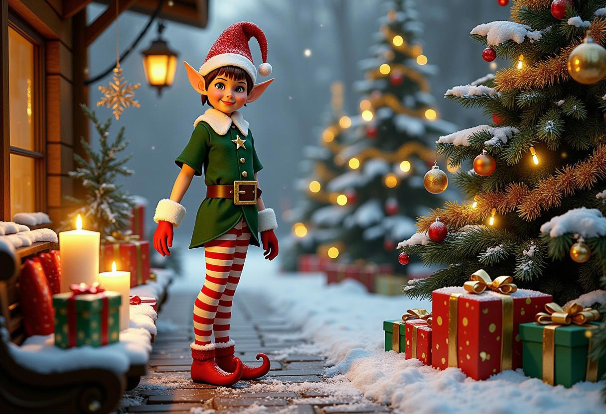 The elf is dressed in a classic green and red outfit, which includes a short tunic with a belt and a star emblem on the front, short sleeves and a matching green belt. Their legs are wearing red-and-white striped stockings with white cuffs, and his feet are shod in pointed red-and-green shoes. The background is decorated with lush festive Christmas trees, fantastic toys, twinkling lights and hanging transparent gold ornaments. Softly glowing candles are placed on the bench next to the elf, surrounded by colorful gift boxes decorated with ribbons. There is a warm, festive atmosphere, enhanced by a light snowfall in the distance and the lights of the side, creating a magical atmosphere. The elf's pose is relaxed and inviting, emphasizing the joyful spirit of the holiday season. The sparkling beauty of Christmas. The style of Michael Cheval, Michael Whelan, Rembrandt, Alex Alemany, Renoir, Alex Gray, surreal, bright colors, masterpiece, artificial image of the highest quality, diffuse lighting, ambient occlusion, Exquisite, masterful surrealism, Photorealistic, unreal engine, 128K, UHD, clear quality, light reflections, RHADS, atmospheric, 3D texture, 3D shading, ultra-three-dimensional effect, octane rendering, volumetric lighting, high-quality artificial intelligence, classical composition, ultra-realistic, clear realism, sharp pencil edges, rich texture and color, pure, ultra-realistic, soft glow, trippy, peyote, DMT