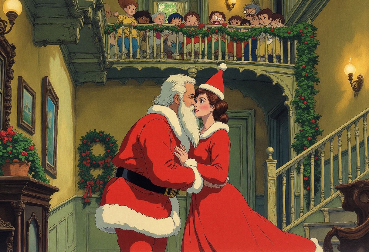 Santa Claus kisses the mother while their children watch with surprise and dismay from the balcony. Modifiers: highly detailed digital painting illustration crisp quality colourful disney very cute pixar cartoon Comic book style Detailed whimsical no watermark cute caricature no frame No Signature Bold colors highly detailed