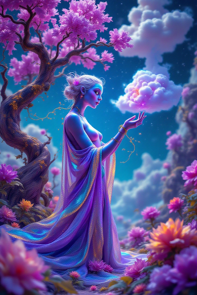 In a vibrant, dreamlike landscape, a fascinating character with iridescent skin. This ethereal being is adorned with flowing garments that undulate like liquid colors—shimmering hues of violet, turquoise, and gold—that catch the light in mesmerizing patterns. Surrounding them is a surreal environment filled with bizarre flora, including enormous flowers that bloom in fractal shapes, their petals glistening as if dusted with stardust. The character's large, expressive eyes reflect an overwhelming sense of wonder as they interact with a peculiar tree that twists and spirals towards the sky, its bark a tapestry of swirling colors. Nearby, a lazily floating cloud resembling a giant cotton candy swirls softly, casting dappled shadows on the ground like a dance of whimsical patterns. The air is thick with a sweet, almost intoxicating scent of unknown blossoms that envelops the scene in an enchanting embrace.