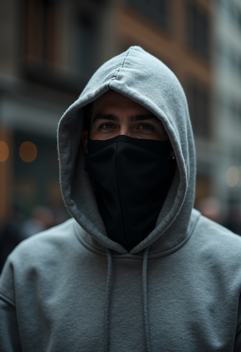 A person wearing a gray sweater with their hood on and a black mask caught on camera kinda grainy film