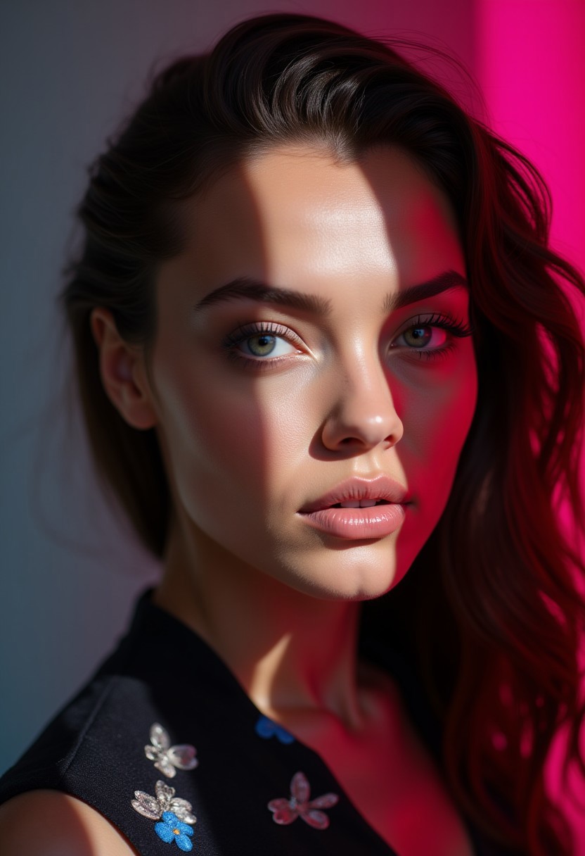 full-high view, modern, high-detailed, colorful, professional photoshoot, vivid color, chiaroscuro lighting, female supermodel with pale skin, high cheekbones, petite face, delicate features