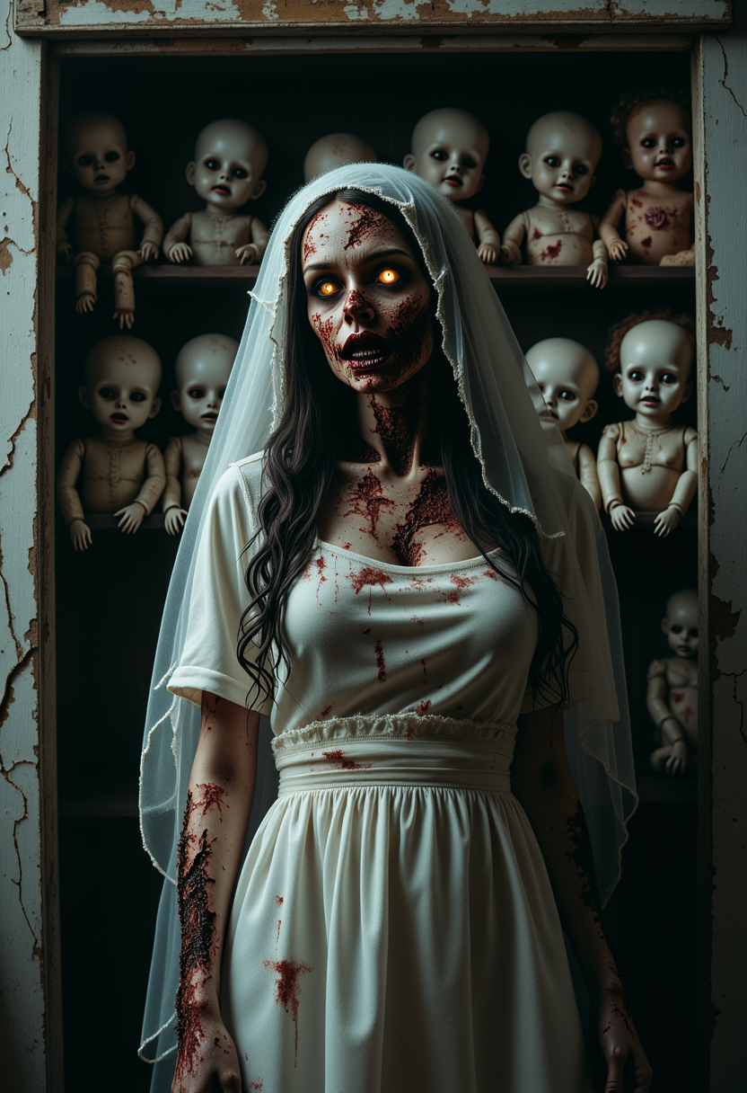 A decayed bride stands in the shadows of a decrepit room, her tattered gown stained and her veil hanging in shreds. Her face is partially torn away, revealing rotting flesh and jagged bone, with one glowing eye fixed on the viewer. Behind her, rows of eerie porcelain dolls with lifeless stares line the cracked shelves, their presence amplifying the chilling, oppressive atmosphere. void.