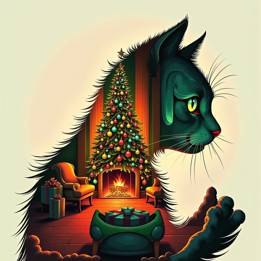double exposure effect of cat silhouette, through cat silhouette we see abstract expressionist painting Pop Art and cubism early 20 century image of xmas living room with xmas tree candles fireplace, straight lines and solids, (((warm colors))), green, intricate details, hologram floating in space, a vibrant digital illustration, dribbble, quantum wavetracing, behance hd, vivid colors, flat color, 2D, strong lines, Pop Art . energetic brushwork, bold colors, abstract forms, expressive, emotional <lora:Christmas_Dreams:1>