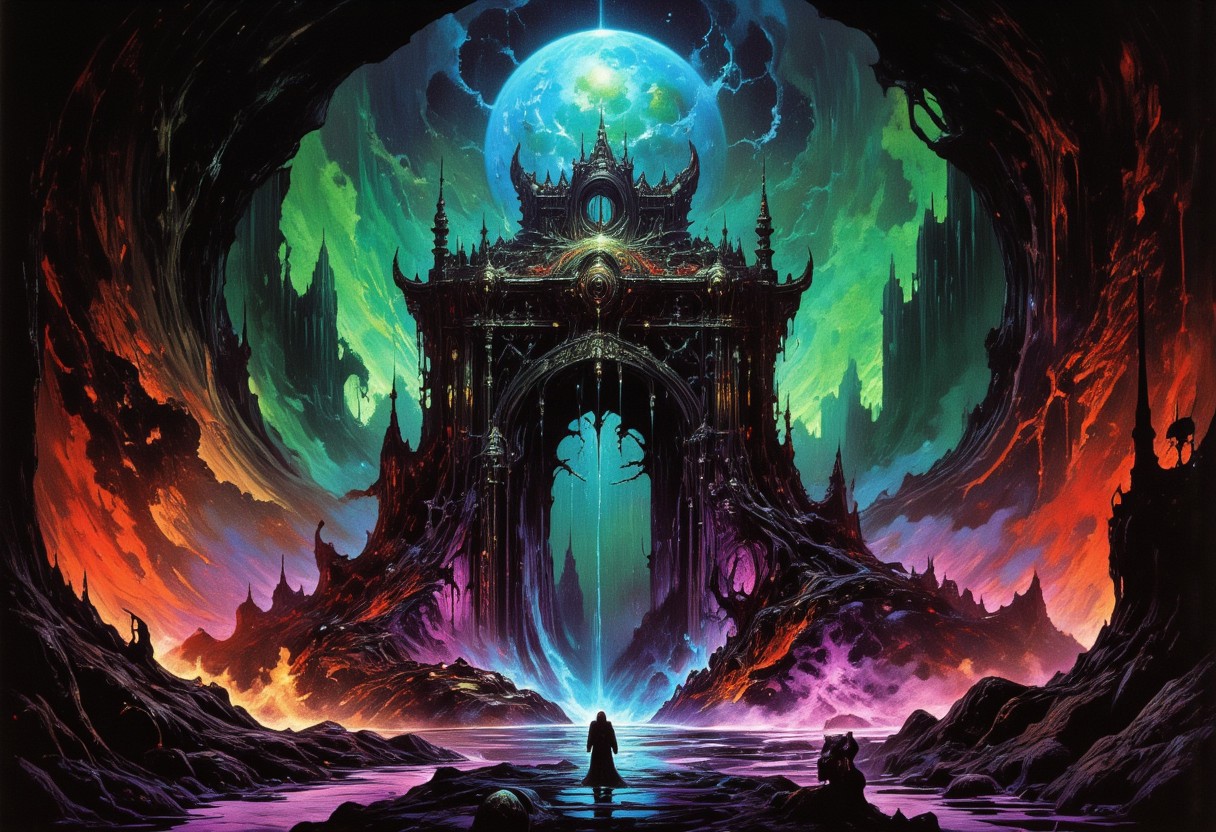 Digital artwork depicting an endless giant hexagonal tower, set against a dramatic, surreal backdrop. The tower is constructed from molten rock and crystals with glowing windows. The structure is illuminated by a few bright dramatic blue lights casting an eerie glow. The background is a swirling chaotic mix of dark greens and deep reds, with a large glowing cyan orb or vortex on the background of the image. The swirling colors create a sense of movement and chaos, suggesting stormy or apocalyptic atmosphere. The ground beneath the tower is a dark, rocky eerie hell landscape, with a few small shadowy silhouettes, adding to the sense of isolation and desolation. purple, rain, world on fire, The overall mood of the artwork is dark and foreboding, with a sense of impending doom or catastrophe. The texture of the artwork is highly detailed and realistic, with focus on the weathered and damaged appearance of the tower, enhancing the sense of decay and abandonment. The image conveys a sense of otherworldly horror and despair. night sky, dark fantasy, Gothic, colorful, vibrant colors, color contrast, light particles, high saturation, deep rich colors, vivid colors, shimmer, mysterious, dramatic, tragic, centered, depth of field, directional lighting, godrays, eerie atmosphere, dense fog, visionary, beyond-reality, horror theme, dreamcore, suspenseful, scenery, low angle, forced perspective, epic scale, (close-up:1.2), Wojtek Fus, Wayne Barlowe, William-Adolphe Bouguereau, Roger Dean