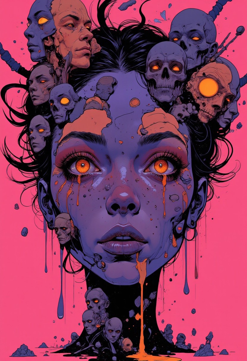 A stylized, surreal digital artwork featuring a haunting depiction of a woman's face as the central focus, her eyes glowing with an intense, fiery orange light that pierces through the composition. Her lips are tightly pursed, and her deep, dark purple skin radiates an air of melancholy and mystery. Tears stream down her cheeks, rendered in glowing trails that amplify the raw emotional intensity of her expression. Surrounding her are countless smaller faces, each unique in their fragmented, abstract form, displaying an array of emotions—sadness, anger, fear—some overlapping with the main figure while others float detached, as if fractured from reality. The vibrant pink background creates a bold contrast to the dark purple tones of the central figure and the fragmented faces, amplifying the chaotic, emotional atmosphere. The sharp, exaggerated lines and vivid hues lend the piece a striking dynamism, while the smooth, glossy texture enhances the richness of the colors, making them almost tangible. The interplay between the glowing eyes, fragmented faces, and the stark background evokes a visceral sense of emotional turmoil and disarray, blending modern surrealism with bold, expressive digital artistry. HD, 8K quality, ultra-detailed, masterpiece artwork.