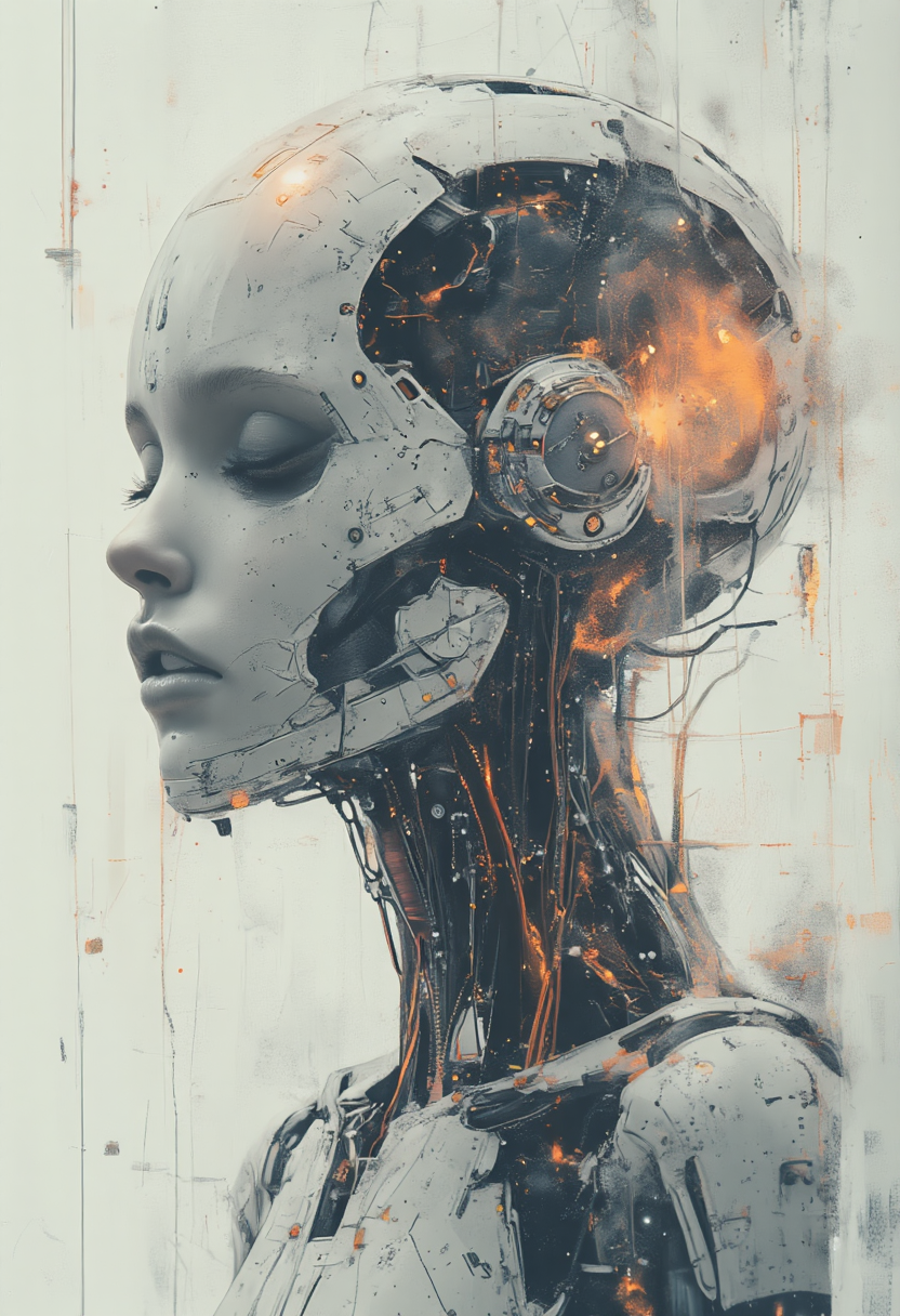 Hearing materialized voices, this creepy sleek cybernetic android can't cope with the illusionary delusions that enter the mind. Distinguishing reality from dream is a constant struggle, like a storm in the brain that cannot be silenced. The constant pain and agony is excruciating and seems impossible to subdue. Clarity and peace of mind is a feeling so unreachable that hope seems to constantly slip through the net that is the maze of life.
