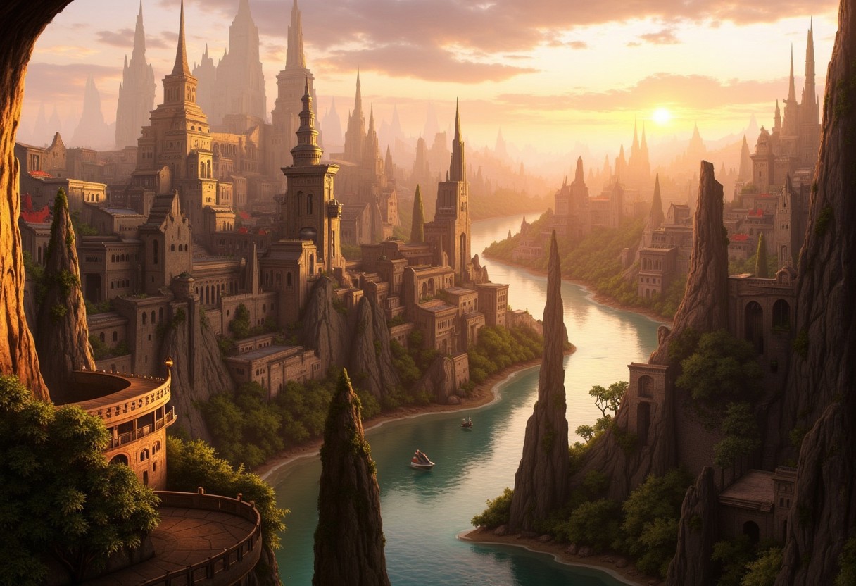 A high-angle view of a magnificent medieval fantasy city inspired by China, nestled along a wide, serene river. Towering buildings rise gently toward the center, adorned with intricate rooftops and vibrant banners fluttering in the breeze. The sunset casts a warm glow, illuminating the scene with hues of orange and gold, creating reflections upon the water. Lush greenery lines the riverbank, and lanterns begin to light up, adding to the ethereal ambiance. A detailed digital painting capturing the enchanting beauty of this urban landscape under the evening sky.