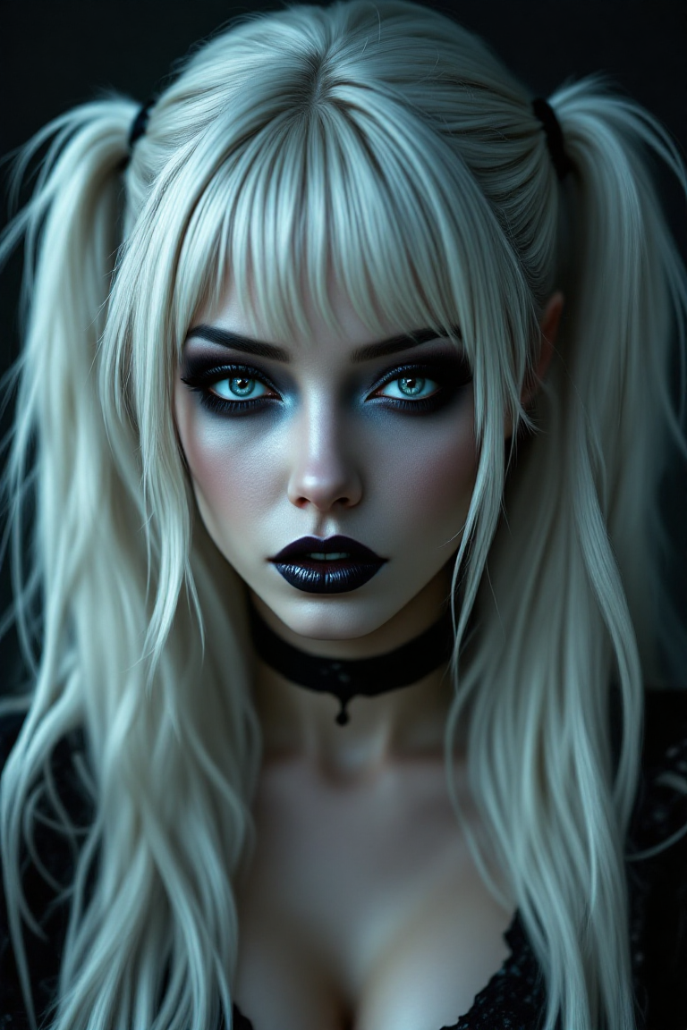 Portrait, myterious hot woman, spooky, black glossy wetlook lipgloss, dark smokey Eyes, pale face, long white stringy hair with sexy two half up Ponytails and Curtain Bangs
