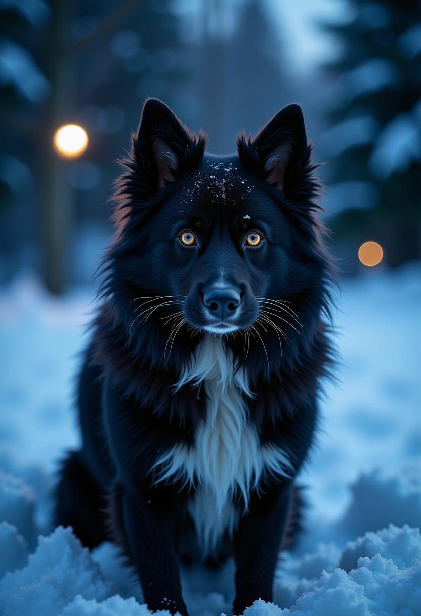 cinematic photo (extreme wide-angle fisheye camera:1.9), (black cat:1.1), (neon line art:0.9), realistic, 35mm photograph, film, bokeh, professional, 4k, highly detailed, very blacl night, black sky, eyes lighting, Сгеу fluffy dog, look at the viewer, (((long shiny winter coat))), ((dark brown and white colors)), winter night, snow, forest, Maine, some snow on him, snowy_landscapes, snow-crystals
