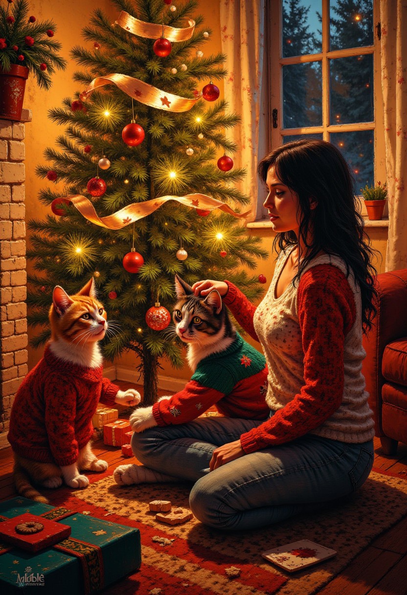 Faith Connors and two cats decorating Christmas tree, Christmas, Christmas party, Christmas tree, cozy, warm lighting, christmas living room, indoors, Cats has fluffy paws and wear Christmas sweaters, Mirror's Edge