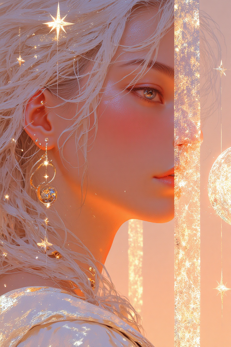 Celestial Dreamer: A hyper-realistic close-up portrait of a pale-skinned woman with long, flowing hair in soft waves, the color of moonlight. Her hair is styled with ethereal curls, floating gently around her face. The woman is partially concealed by a glowing curtain draped across her figure, the fabric adorned with interwoven starburst and crescent moon patterns, their luminous gold and silver threads sparkling and gleaming as if they are woven from stardust. The curtain shimmers with light as if the stars themselves are contained within it. The warm peach background contrasts beautifully with the gleaming curtain, creating a dreamlike atmosphere. The curtain veils part of her face, adding an air of mystery to her soft, serene expression. High quality rendering, 8K.