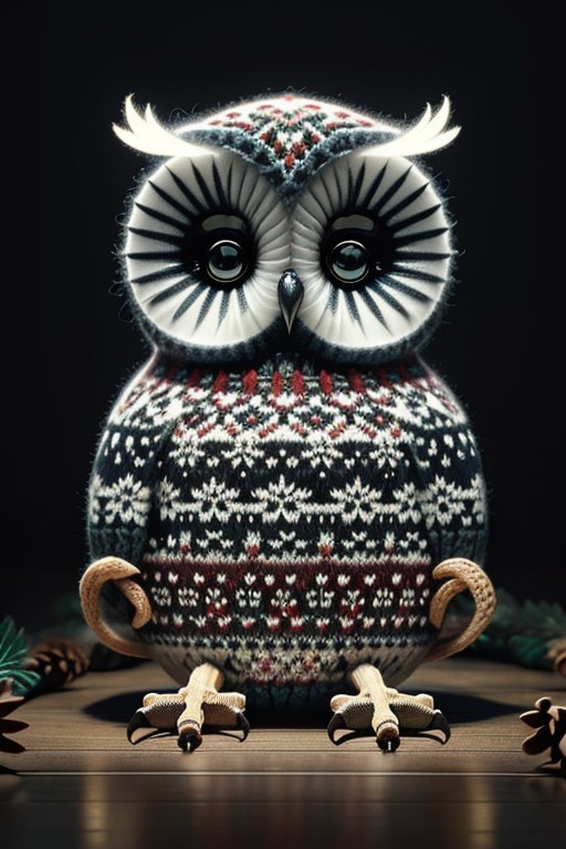 masterpiece, best quality, Christmas sweater fashion show, runway, owl wearing knitwear, in spotlight, festive designs, creative patterns, no humans