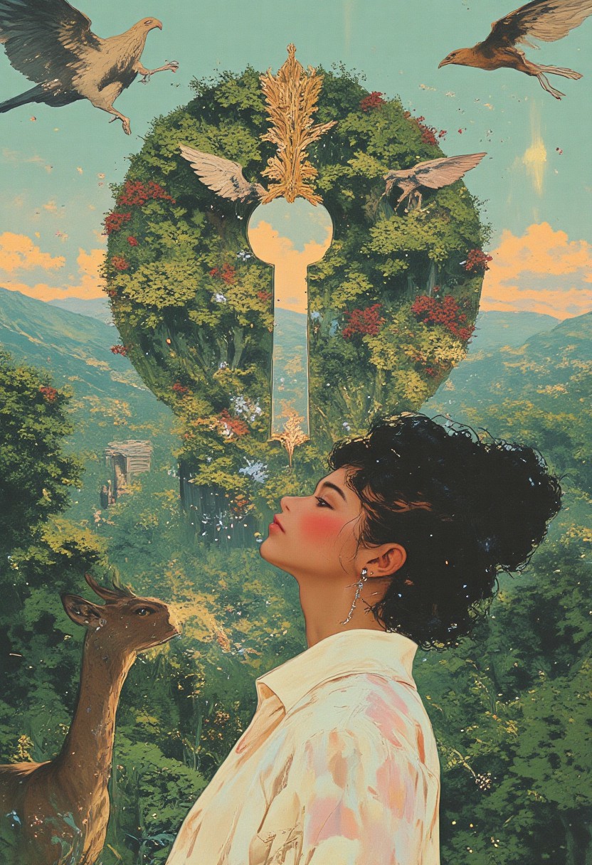 This is a digitally created collage image with a surreal, dreamlike quality. The central figure is a woman with closed eyes and a serene expression, her head and shoulders forming the shape of a keyhole. She wears a white dress with a high collar and her hair is styled in an elegant updo. The background features a lush, green forest with tall trees and dense foliage. Birds, including a brown hawk and a small blue bird, are perched on the branches above her. In the upper left corner, a deer with large antlers is standing in the forest, and in the upper right, a brown hawk is flying. The sky above the trees is a vivid blue, transitioning into a soft orange and pink sunset near the horizon. A green snake with white spots coils around the woman's arm, adding an element of contrast and mystery. The light green background of the image contrasts with the vibrant colors of the forest and sky, making the central figure and her surroundings stand out prominently. The overall composition is intricate, blending elements of nature, surrealism, and human form, creating a visually striking and thought-provoking piece of art.