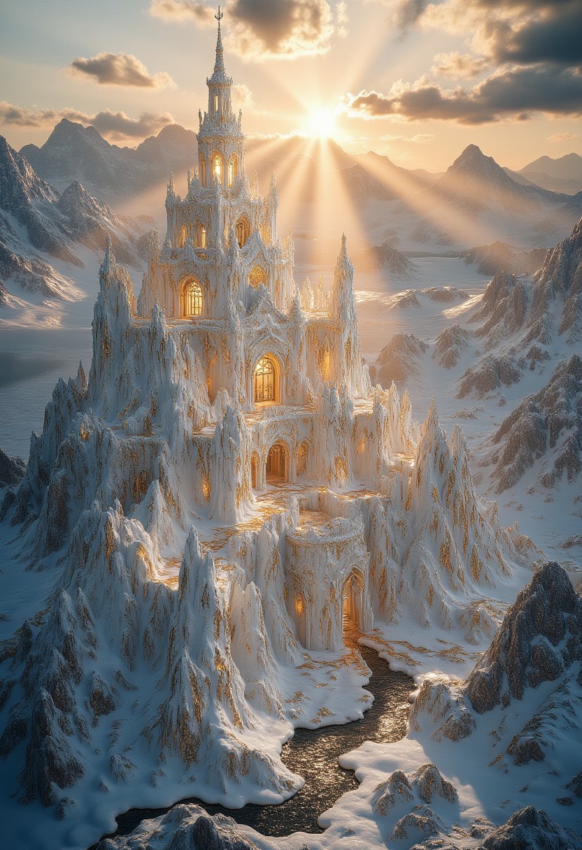 Create a complex and highly detailed high elven city in Gold Porcelain style. the view is from high above, birdseye view. sun rays, the sun is shining, gorgeous view, dreamlike, ethereal, fantastic, masterpiece, award winning, stunning, snow, cloudy