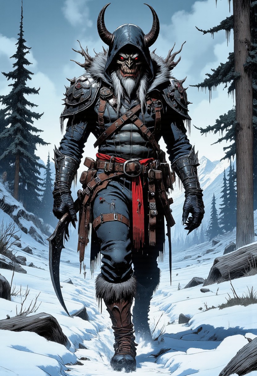 Comic book style, KrampusStyle, The male Krampus commando moves stealthily through the snow-covered North Pole Hinterlands, his dark, imposing figure blending with the shadows. His rugged attire is made for covert operations: a black, weathered leather tunic, reinforced with metal plates, and dark fur-lined pants that allow for silent movement. Over his chest, a jagged red sash signifies his rank. His boots, heavy yet silent, crunch softly in the snow, and he wears a hooded cloak, its edges tattered from harsh environments. His face, half-hidden by a menacing mask with sharp horns, reveals glowing red eyes that scan the surroundings with precision. Strapped to his back is a jagged, wicked-looking scythe, and his hands grip a set of dark, clawed gauntlets. He blends into the frostbitten landscape like a shadow, ready for action.