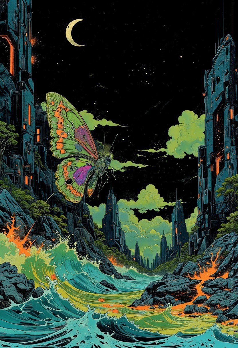 A highly stylized digitally drawn hyper-realistic artwork featuring a dramatic seascape illuminated by a toxic-colored palette. The scene is set under a crescent moon, with shimmering stars scattered across the night sky. Waves of the sea are painted in vibrant neon hues—neon green, electric pink, cobalt blue, and fluorescent orange—flowing and crashing against monumental stone structures and futuristic towers that stretch high into the sky. These buildings rise with sharp angles, their forms abstract and otherworldly, adorned in toxic colors that reflect the eerie glow of the moon. The sky above is dark, with a few single fluffy clouds, softly glowing in hues of lime green and neon yellow, creating an ethereal contrast to the deep backdrop. The ocean below mirrors the chaos of the sky, with waves of electric blue and fluorescent green intertwining and glowing, creating an optical illusion of movement. A colossal titan butterfly, its wings decorated with swirling patterns of neon red and bright purple, hovers in the sky, its wings unfurled, casting a large shadow over the scene. The surreal, dreamlike atmosphere of the scene is enhanced by the toxic color palette, where every element of the landscape pulses with otherworldly energy, creating a mystical, vibrant world. Inspired by the style of Yoshitaka Amano.