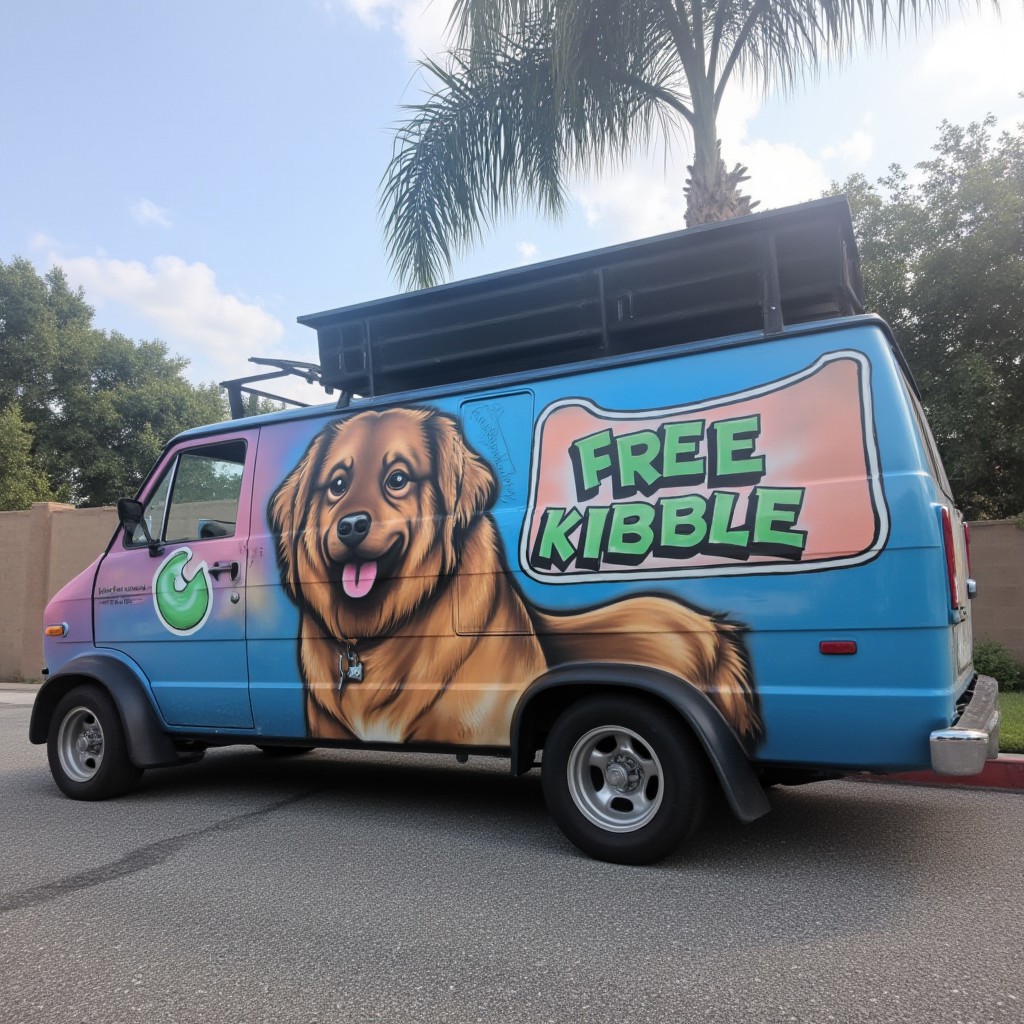 A mural depicting a happy liathedog, with the text "FREE KIBBLE", airbrushed onto the side of a retro art van