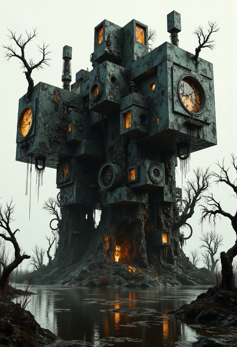 ff-desolascape, a large geometric building rising from a swamp, constructed atop the exposed skeleton of an ancient giant. The structure is composed of stacked geometric objects. Ancient, petrified trees grow out of the building, their gnarled roots merging into its walls. Small fires flicker within others. Gears and mechanical parts are integrated into the structure. Quiet tension, majestic and alien amidst the eerie swamp.